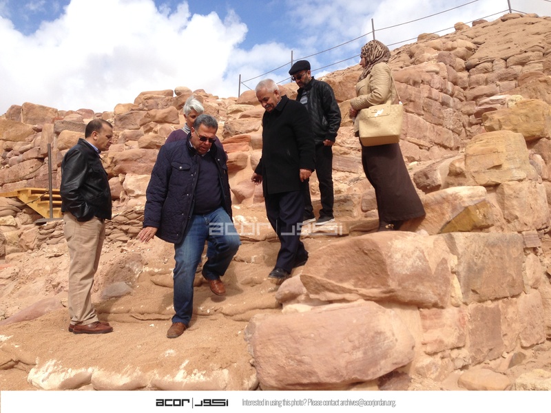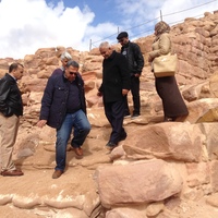 Jordan. Petra, Temple of the Winged Lions, Director General of Dept. of Antiquities Dr. Monther Jamhawi with Elena Ronza, Sana Al Hamadeen, Jehad Haron, Ghassan Al Deir, climbing near pronaos in southeast quadrant