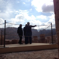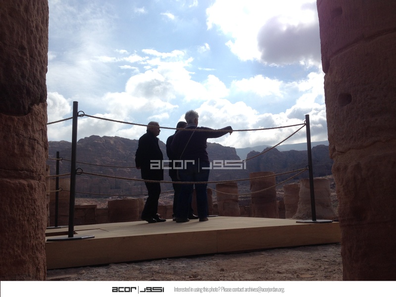 Jordan. Petra, Temple of the Winged Lions, Director General of the Dept. of Antiquities Dr. Monther Jamhawi with Elena Ronza and Mohammad Shobaki, looking into the entrance to the temple