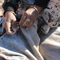 Jordan. Petra, Temple of the Winged Lions, team member sewing sandbags