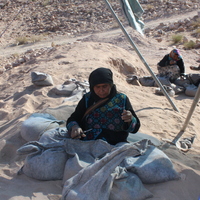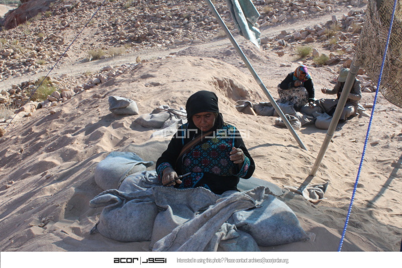 Jordan. Petra, Temple of the Winged Lions, team member Ageleh Jmeidi making sandbags