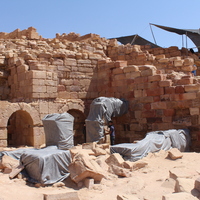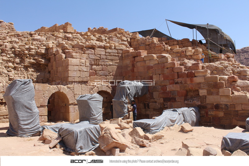 Jordan. Petra, Temple of the Winged Lions, southwest quadrant, team member wrapping architectural elements in geotextile to protect them prior to backfilling