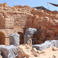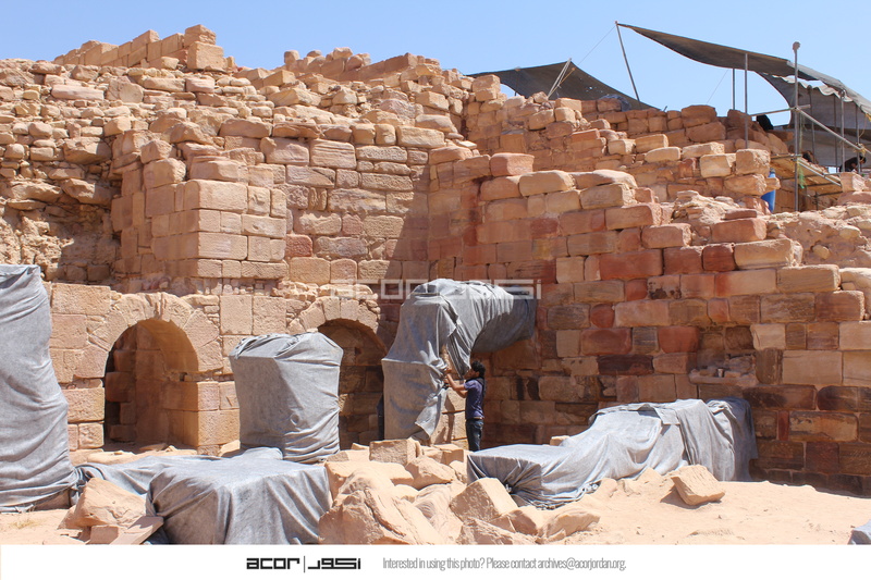 Jordan. Petra, Temple of the Winged Lions, southwest quadrant, team member wrapping architectural elements in geotextile to protect them prior to backfilling