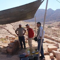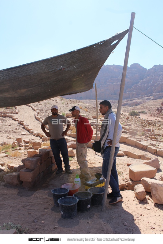 Jordan. Petra, Temple of the Winged Lions, Ahmad Mowasa (in red) and other team members under shade with conservation materials
