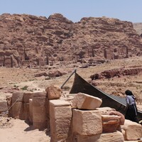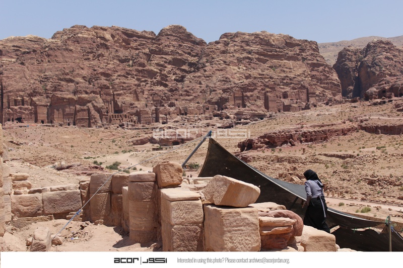 Jordan. Petra, Temple of the Winged Lions, southeast quadrant, facing east, showing TWL team member and Royal Tombs in background