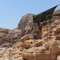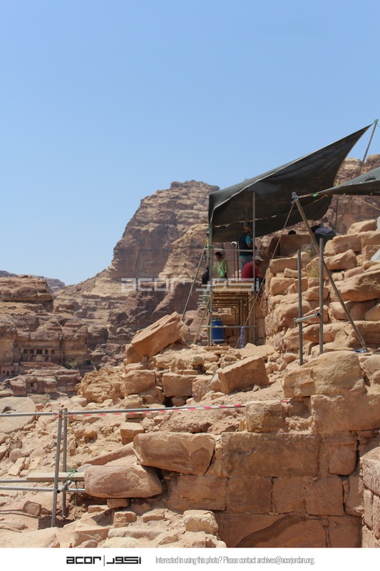 Jordan. Petra, Temple of the Winged Lions, scaffolding and shade, team members working by pronaos on the south side of temple
