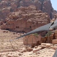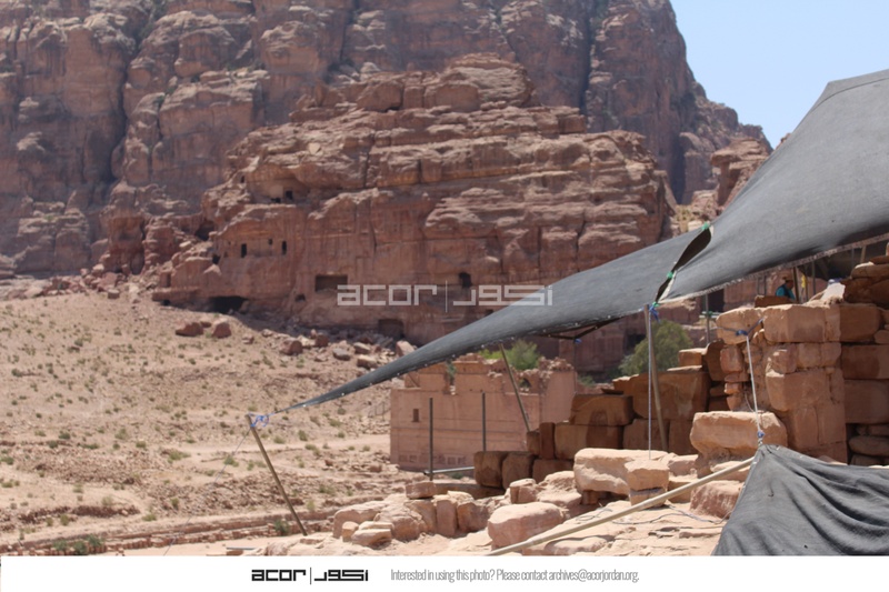 Jordan. Petra, Temple of the Winged Lions, southest quadrant, looking southwest with shade over pronaos and Qasr al Bint in background