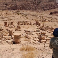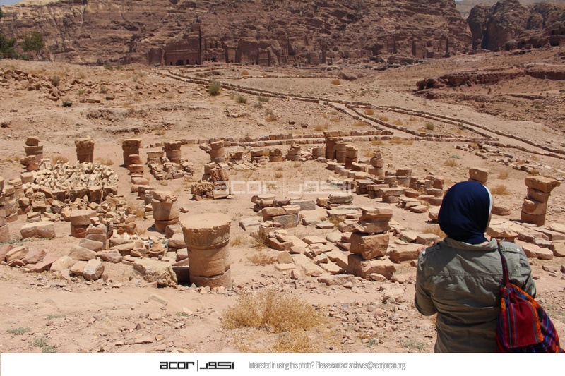 Jordan. Petra, Temple of the Winged Lions, site steward Eman Abdessalam at lapidarium