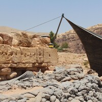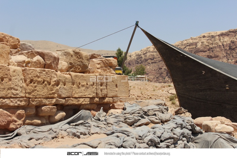 Jordan. Petra, Temple of the Winged Lions, sandbags and geotextiles draped over to keep water from entering, in front of pronaos