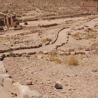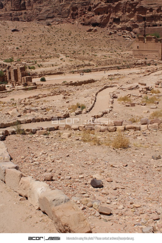 Jordan. Petra, Temple of the Winged Lions, pathway on TWL site, Temenos Gate and Qasr al Bint in background