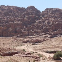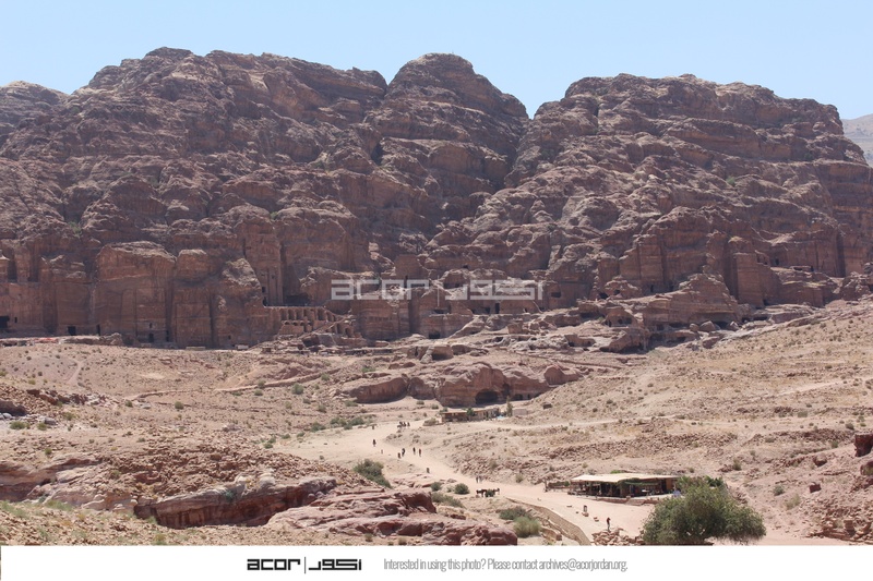 Jordan. Petra, Temple of the Winged Lions, view from the temple to Royal Tombs, with pathway and Nymphaeum spring