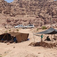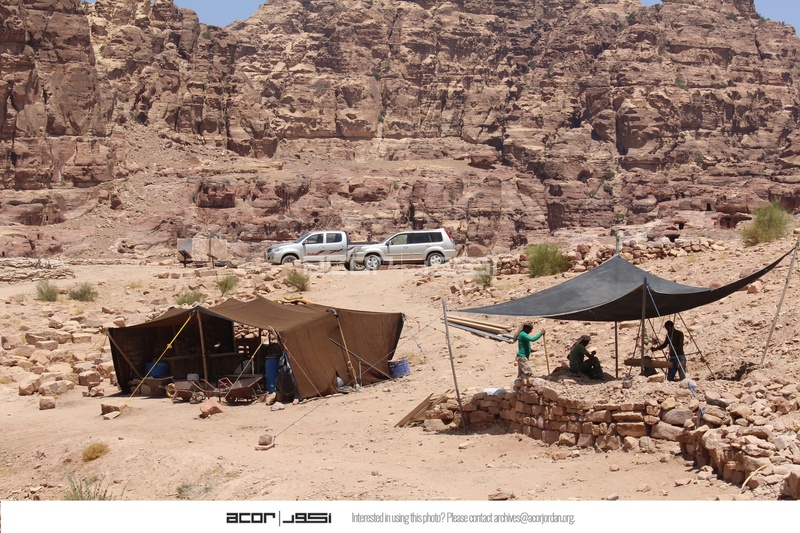 Jordan. Petra, Temple of the Winged Lions, team members in second sifting station near to tent on east side of temple