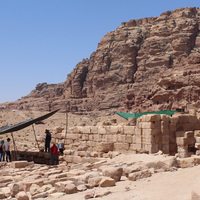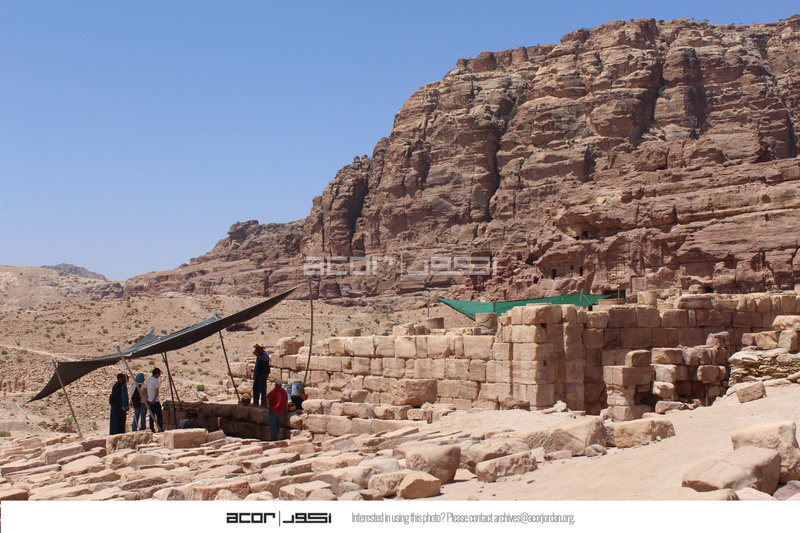 Jordan. Petra, Temple of the Winged Lions, east wall of TWL, Umm al Biyara in background, team members under shade