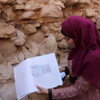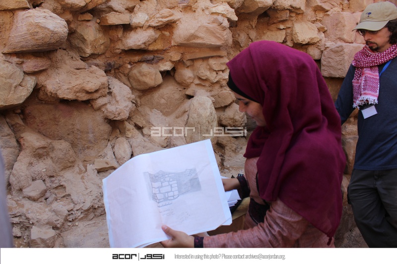 Jordan. Petra, Temple of the Winged Lions, Halemah al Nawafleh conducts condition documentation of wall in southwest section