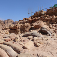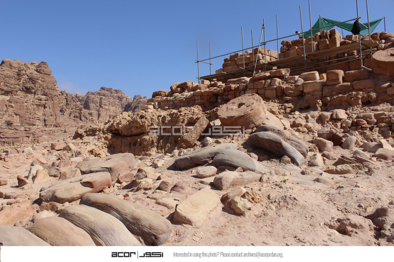 Jordan. Petra, Temple of the Winged Lions, south side of temple facing northwest, fallen columns in foreground