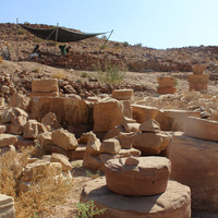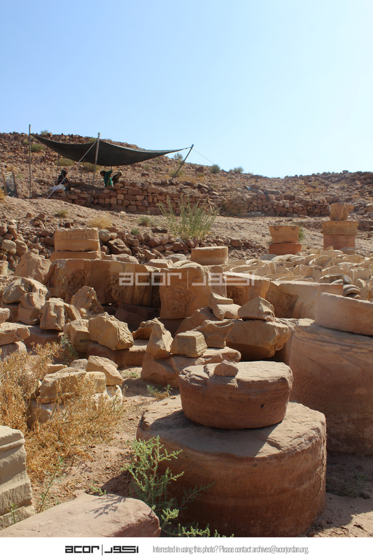 Jordan. Petra, Temple of the Winged Lions, lapidarium, looking northeast, sifting tent in background