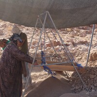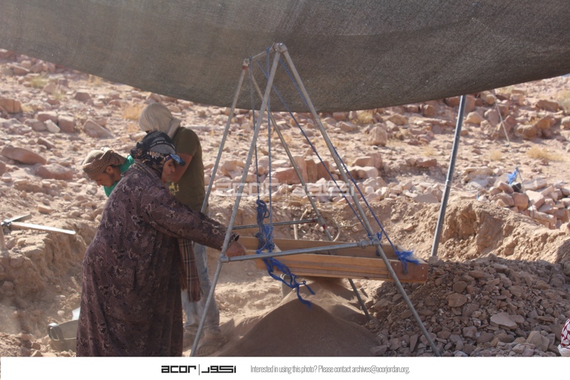 Jordan. Petra, Temple of the Winged Lions, local team members sifting sand to fill sandbags which are used in conservation