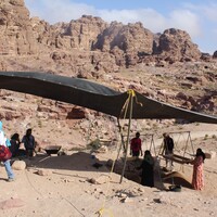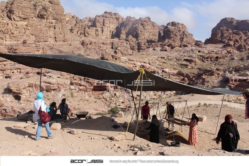 Jordan. Petra, Temple of the Winged Lions, local team members sifting sand to fill sandbags which are used in conservation