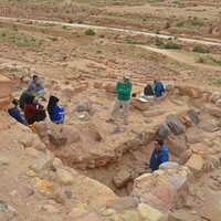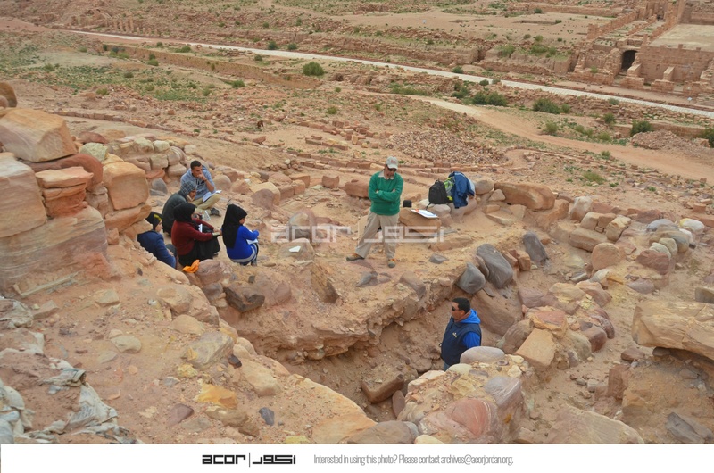 Jordan. Petra, Temple of the Winged Lions, trench in front of cella to the south, team members