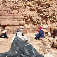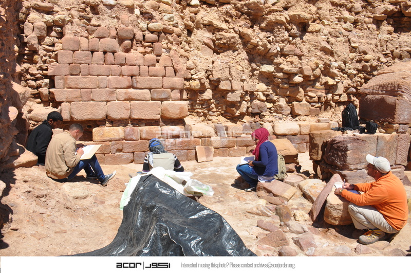 Jordan. Petra, Temple of the Winged Lions, southwest quadrant, remains of a rubble slope retaining wall, team members documenting