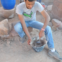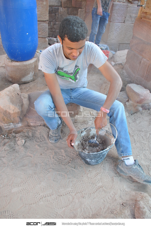 Jordan. Petra, Temple of the Winged Lions, team member mixing mortar to close gaps between stones in walls, as was done by the Nabataeans