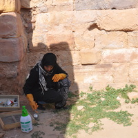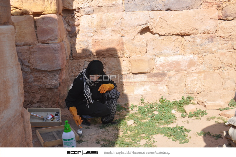 Jordan. Petra, Temple of the Winged Lions, team member in conservation training, bottle likely contains a diluted herbicide that kills weeds