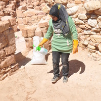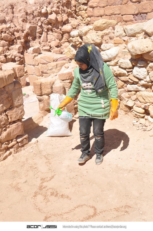Jordan. Petra, Temple of the Winged Lions, team member in conservation training, bottle likely contains a diluted herbicide that kills weeds