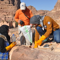 Jordan. Petra, Temple of the Winged Lions, team members conducting conservation work, hand pick, trowel