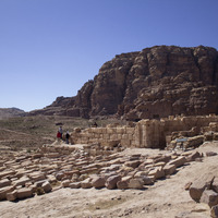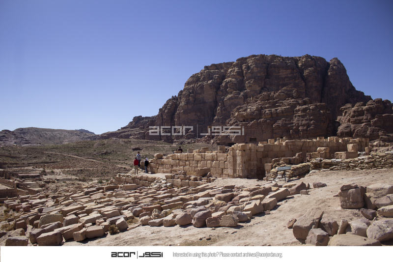Jordan. Petra, Temple of the Winged Lions, temple with lapidarium (architectural stone gallery), with Umm al Biyara in the background