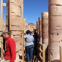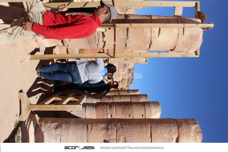 Jordan. Petra, Temple of the Winged Lions, west aisle, columns with wooden brace on left and wooden barrier on right, team members
